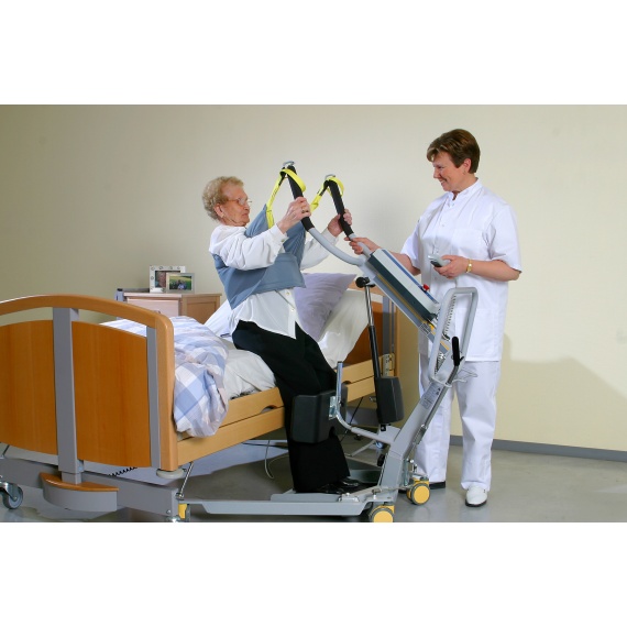 La principal ventaja de la grúa Bipedestación 1620 reside en que la parte inferior del cuerpo queda libre para realizar cualquier movimiento, de tal manera que el cuidador puede vestir y desvestir a la persona sin ningún tipo de dificultad. El usuario puede mantenerse de pie sostenido por la espalda y bajo los brazos mediante los arneses Handi-Move. Los arneses activos Handi-Move se instalan rápida y fácilmente, sin ejercer una presión excesiva sobre los hombros. El sistema está concebido para sostener el cuerpo en la medida de lo posible sin sobrecargar los hombros. El elevador de personas activo es también muy útil para las personas con incontinencia.